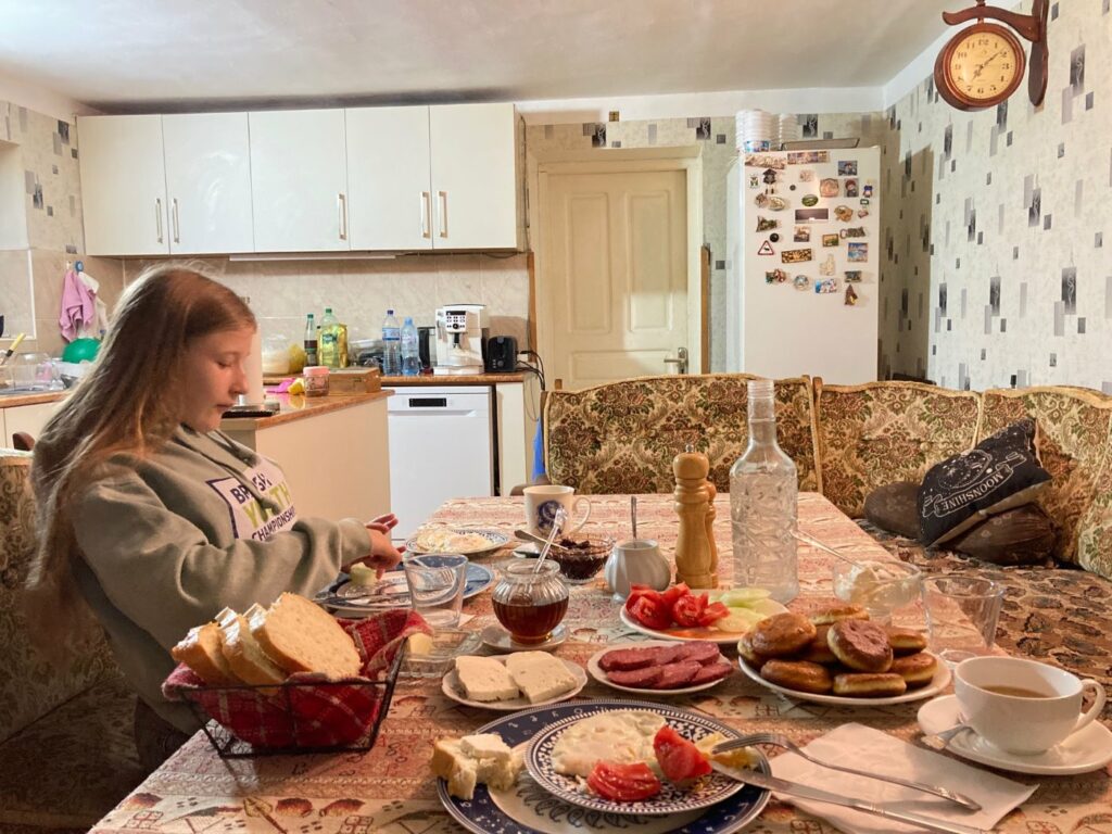As we were walking through the streets, we saw lots of trees that grew something that looked like a cross between apple and tomato however, it wasn’t one… We asked the family that owned the guesthouse and they said that the fruit we saw was called Kaki/ Persimmon. This fruit is very popular throughout Georgia and even the taxi driver had one as a snack in his car! The elderly lady who owned the house, prepared the breakfast and cooked dinner for us, was very generous and gave us a bag full of Kaki to share with our friends and family back at home.