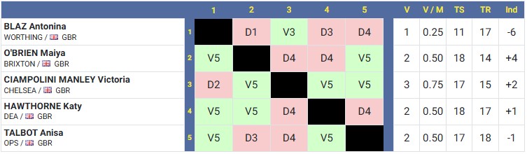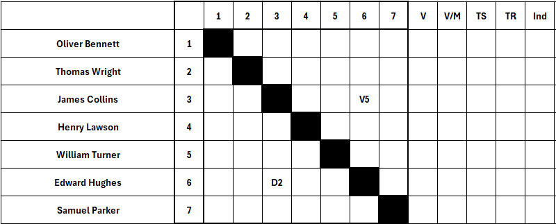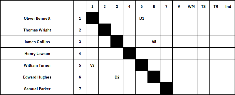 At the intersection of row 3 (Collins) and column 6 (Hughes) we will record Collins’ result as V5 (Victory, 5 touches scored).