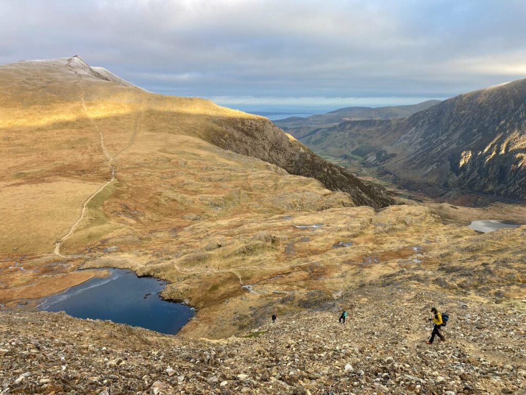 Soon we reached the first mountain on our agenda, Y Garn, where a large black bird circled above the summit. We hiked past the oversized raven and carried on down the other side of the mountain. After a short walk downhill, we arrived at a small, completely frozen lake, Llyn Y Cwn , where we couldn’t resist throwing some rocks and pebbles onto the ice.
